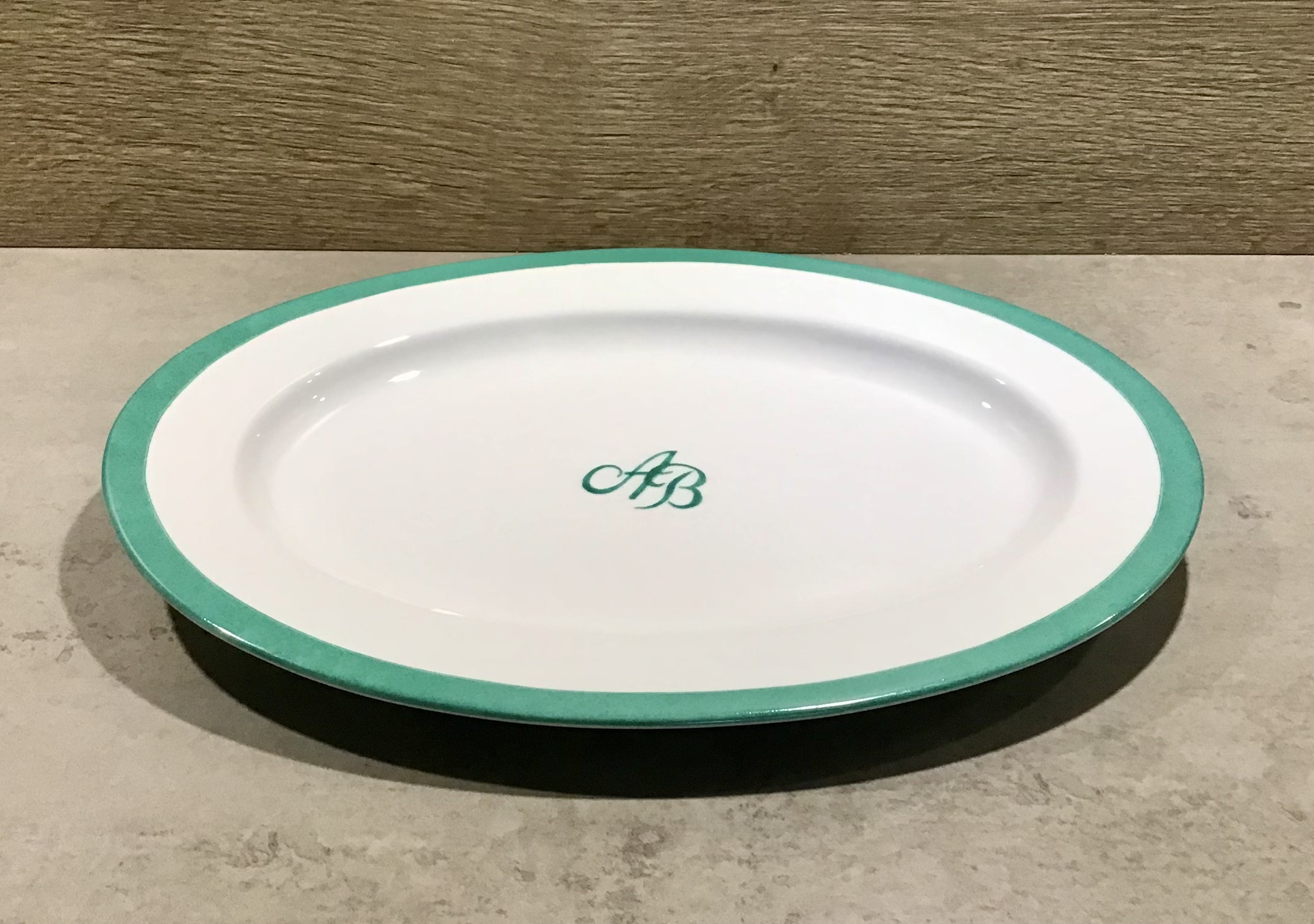 Service de 12 tasses à café monogrammes entrelacés, initiales de jeunes mariés. Bordures et anses grises motifs sur commande.