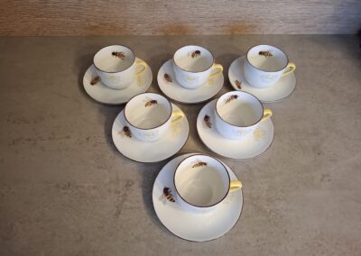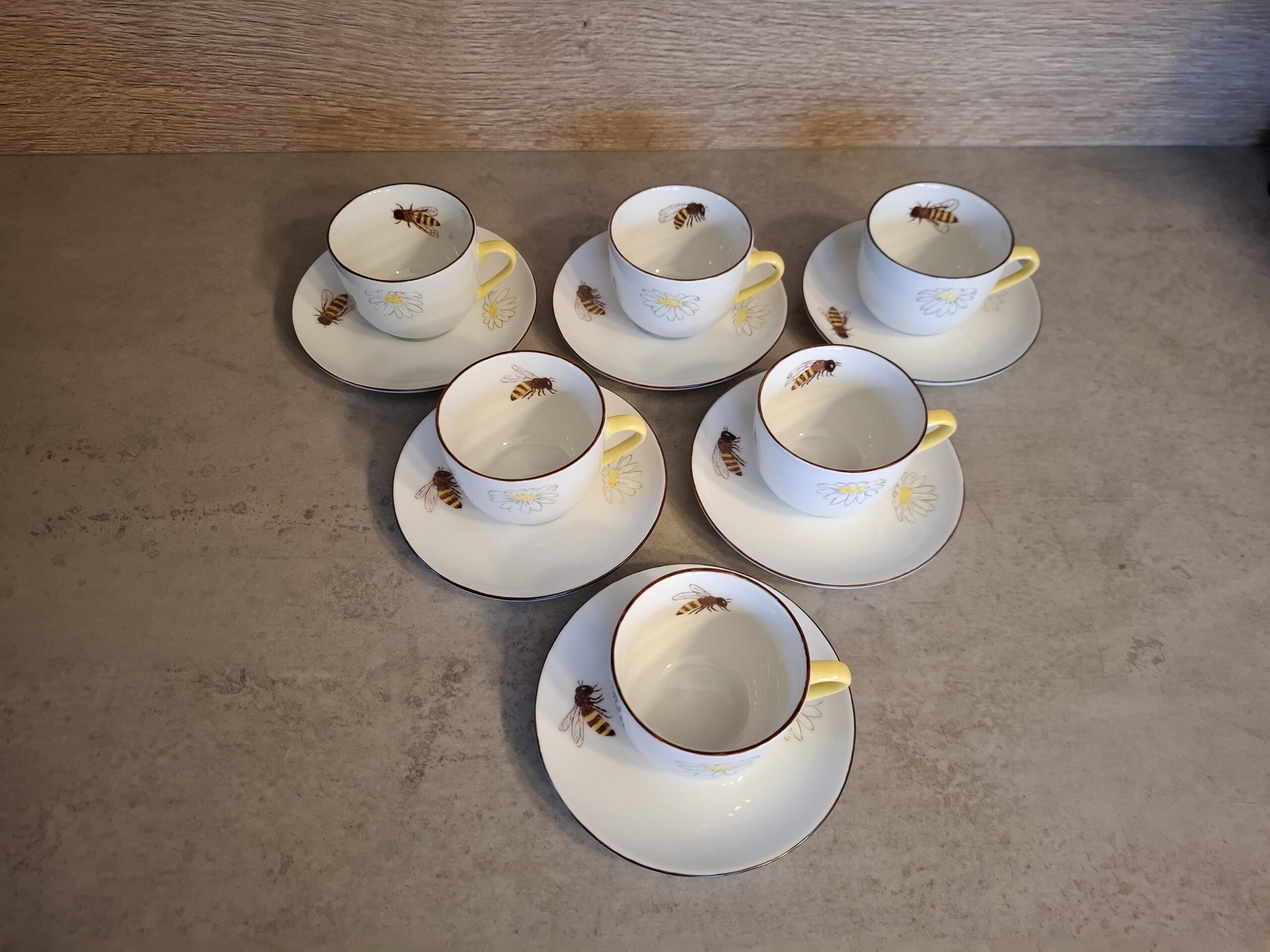 Service à café abeilles et marguerites sur tasse et sous-tasse. Anse jaune et liseré marron